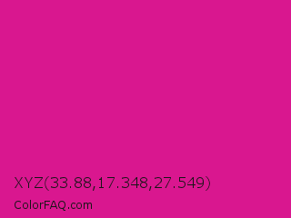 XYZ 33.88,17.348,27.549 Color is a normal magenta color and the nearest color is Barbie Pink #e0218a. Hex code #d9178f and RGB value is rgb(217,23,143). In RGB color space, this color is composed of 85% red, 9% green, 56% blue, In CMYK color space, this color is composed of 0% cyan, 89% magenta, 34% yellow , 15% black , In HSL color space, this color has a hue angle of 323° , 81% saturation and 47% lightness.