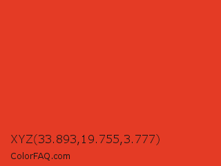 XYZ 33.893,19.755,3.777 Color is a normal red color and the nearest color is CG Red #e03c31. Hex code #e43b25 and RGB value is rgb(228,59,37). In RGB color space, this color is composed of 89% red, 23% green, 15% blue, In CMYK color space, this color is composed of 0% cyan, 74% magenta, 84% yellow , 11% black , In HSL color space, this color has a hue angle of 7° , 78% saturation and 52% lightness.