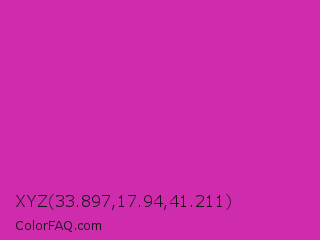 XYZ 33.897,17.94,41.211 Color is a normal magenta color and the nearest color is Byzantine #bd33a4. Hex code #ce2cad and RGB value is rgb(206,44,173). In RGB color space, this color is composed of 81% red, 17% green, 68% blue, In CMYK color space, this color is composed of 0% cyan, 79% magenta, 16% yellow , 19% black , In HSL color space, this color has a hue angle of 312° , 65% saturation and 49% lightness.