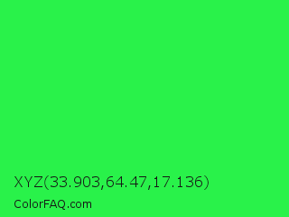 XYZ 33.903,64.47,17.136 Color is a normal green color and the nearest color is Malachite #0bda51. Hex code #29f24a and RGB value is rgb(41,242,74). In RGB color space, this color is composed of 16% red, 95% green, 29% blue, In CMYK color space, this color is composed of 83% cyan, 0% magenta, 69% yellow , 5% black , In HSL color space, this color has a hue angle of 130° , 89% saturation and 55% lightness.