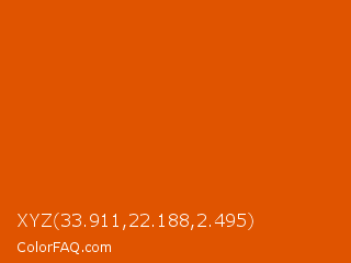 XYZ 33.911,22.188,2.495 Color is a normal orange color and the nearest color is Trinidad #e64e03. Hex code #e05400 and RGB value is rgb(224,84,0). In RGB color space, this color is composed of 88% red, 33% green, 0% blue, In CMYK color space, this color is composed of 0% cyan, 63% magenta, 100% yellow , 12% black , In HSL color space, this color has a hue angle of 23° , 100% saturation and 44% lightness.