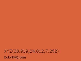 XYZ 33.919,24.012,7.262 Color is a normal color and the nearest color is Medium Vermilion #d9603b. Hex code #d9633d and RGB value is rgb(217,99,61). In RGB color space, this color is composed of 85% red, 39% green, 24% blue, In CMYK color space, this color is composed of 0% cyan, 54% magenta, 72% yellow , 15% black , In HSL color space, this color has a hue angle of 15° , 67% saturation and 55% lightness.