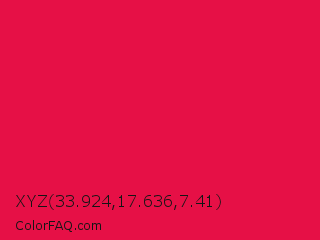 XYZ 33.924,17.636,7.41 Color is a normal red color and the nearest color is Red Ribbon #ed0a3f. Hex code #e61046 and RGB value is rgb(230,16,70). In RGB color space, this color is composed of 90% red, 6% green, 27% blue, In CMYK color space, this color is composed of 0% cyan, 93% magenta, 70% yellow , 10% black , In HSL color space, this color has a hue angle of 345° , 87% saturation and 48% lightness.