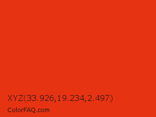 XYZ 33.926,19.234,2.497 Color is a normal red color and the nearest color is Vermilion #d9381e. Hex code #e63312 and RGB value is rgb(230,51,18). In RGB color space, this color is composed of 90% red, 20% green, 7% blue, In CMYK color space, this color is composed of 0% cyan, 78% magenta, 92% yellow , 10% black , In HSL color space, this color has a hue angle of 9° , 85% saturation and 49% lightness.