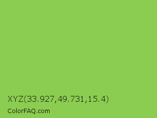 XYZ 33.927,49.731,15.4 Color is a normal green color and the nearest color is Dollar Bill #85bb65. Hex code #8bcd50 and RGB value is rgb(139,205,80). In RGB color space, this color is composed of 55% red, 80% green, 31% blue, In CMYK color space, this color is composed of 32% cyan, 0% magenta, 61% yellow , 20% black , In HSL color space, this color has a hue angle of 92° , 56% saturation and 56% lightness.