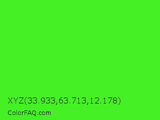 XYZ 33.933,63.713,12.178 Color is a normal green color and the nearest color is Neon Green #39ff14. Hex code #45f024 and RGB value is rgb(69,240,36). In RGB color space, this color is composed of 27% red, 94% green, 14% blue, In CMYK color space, this color is composed of 71% cyan, 0% magenta, 85% yellow , 6% black , In HSL color space, this color has a hue angle of 110° , 87% saturation and 54% lightness.