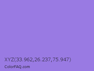 XYZ 33.962,26.237,75.947 Color is a light indigo color and the nearest color is Medium Purple #9370db. Hex code #997ae3 and RGB value is rgb(153,122,227). In RGB color space, this color is composed of 60% red, 48% green, 89% blue, In CMYK color space, this color is composed of 33% cyan, 46% magenta, 0% yellow , 11% black , In HSL color space, this color has a hue angle of 258° , 65% saturation and 68% lightness.