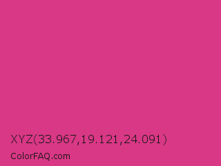 XYZ 33.967,19.121,24.091 Color is a normal rose color and the nearest color is Cerise #da3287. Hex code #d83885 and RGB value is rgb(216,56,133). In RGB color space, this color is composed of 85% red, 22% green, 52% blue, In CMYK color space, this color is composed of 0% cyan, 74% magenta, 38% yellow , 15% black , In HSL color space, this color has a hue angle of 331° , 67% saturation and 53% lightness.