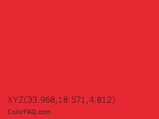XYZ 33.968,18.571,4.812 Color is a normal red color and the nearest color is Alizarin Crimson #e32636. Hex code #e62832 and RGB value is rgb(230,40,50). In RGB color space, this color is composed of 90% red, 16% green, 20% blue, In CMYK color space, this color is composed of 0% cyan, 83% magenta, 78% yellow , 10% black , In HSL color space, this color has a hue angle of 357° , 79% saturation and 53% lightness.