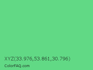 XYZ 33.976,53.861,30.796 Color is a light green color and the nearest color is Very Light Malachite Green #64e986. Hex code #61d985 and RGB value is rgb(97,217,133). In RGB color space, this color is composed of 38% red, 85% green, 52% blue, In CMYK color space, this color is composed of 55% cyan, 0% magenta, 39% yellow , 15% black , In HSL color space, this color has a hue angle of 138° , 61% saturation and 62% lightness.