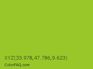 XYZ 33.978,47.786,9.623 Color is a normal lime color and the nearest color is Atlantis #97cd2d. Hex code #99c72a and RGB value is rgb(153,199,42). In RGB color space, this color is composed of 60% red, 78% green, 16% blue, In CMYK color space, this color is composed of 23% cyan, 0% magenta, 79% yellow , 22% black , In HSL color space, this color has a hue angle of 78° , 65% saturation and 47% lightness.