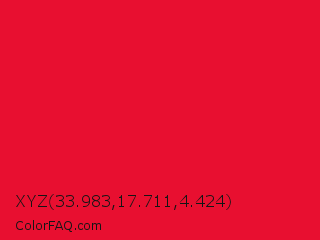 XYZ 33.983,17.711,4.424 Color is a normal red color and the nearest color is Medium Candy Apple Red #e2062c. Hex code #e80f30 and RGB value is rgb(232,15,48). In RGB color space, this color is composed of 91% red, 6% green, 19% blue, In CMYK color space, this color is composed of 0% cyan, 94% magenta, 79% yellow , 9% black , In HSL color space, this color has a hue angle of 351° , 88% saturation and 48% lightness.