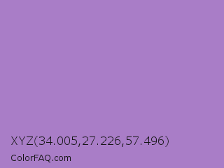 XYZ 34.005,27.226,57.496 Color is a light purple color and the nearest color is African Violet #b284be. Hex code #a97dc7 and RGB value is rgb(169,125,199). In RGB color space, this color is composed of 66% red, 49% green, 78% blue, In CMYK color space, this color is composed of 15% cyan, 37% magenta, 0% yellow , 22% black , In HSL color space, this color has a hue angle of 276° , 40% saturation and 64% lightness.