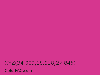 XYZ 34.009,18.918,27.846 Color is a normal magenta color and the nearest color is Cerise #da3287. Hex code #d6368f and RGB value is rgb(214,54,143). In RGB color space, this color is composed of 84% red, 21% green, 56% blue, In CMYK color space, this color is composed of 0% cyan, 75% magenta, 33% yellow , 16% black , In HSL color space, this color has a hue angle of 327° , 66% saturation and 53% lightness.