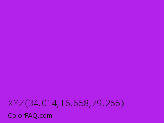 XYZ 34.014,16.668,79.266 Color is a normal purple color and the nearest color is Veronica #a020f0. Hex code #b322ea and RGB value is rgb(179,34,234). In RGB color space, this color is composed of 70% red, 13% green, 92% blue, In CMYK color space, this color is composed of 24% cyan, 85% magenta, 0% yellow , 8% black , In HSL color space, this color has a hue angle of 284° , 83% saturation and 53% lightness.