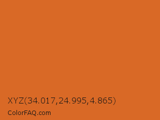 XYZ 34.017,24.995,4.865 Color is a normal orange color and the nearest color is Vivid Red Tangelo #df6124. Hex code #d96926 and RGB value is rgb(217,105,38). In RGB color space, this color is composed of 85% red, 41% green, 15% blue, In CMYK color space, this color is composed of 0% cyan, 52% magenta, 82% yellow , 15% black , In HSL color space, this color has a hue angle of 22° , 70% saturation and 50% lightness.