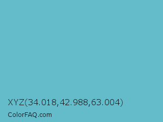 XYZ 34.018,42.988,63.004 Color is a normal cyan color and the nearest color is Fountain Blue #56b4be. Hex code #64bccb and RGB value is rgb(100,188,203). In RGB color space, this color is composed of 39% red, 74% green, 80% blue, In CMYK color space, this color is composed of 51% cyan, 7% magenta, 0% yellow , 20% black , In HSL color space, this color has a hue angle of 189° , 50% saturation and 59% lightness.