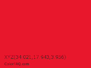XYZ 34.021,17.943,3.956 Color is a normal red color and the nearest color is Red Pigment #ed1c24. Hex code #e8172b and RGB value is rgb(232,23,43). In RGB color space, this color is composed of 91% red, 9% green, 17% blue, In CMYK color space, this color is composed of 0% cyan, 90% magenta, 81% yellow , 9% black , In HSL color space, this color has a hue angle of 354° , 82% saturation and 50% lightness.