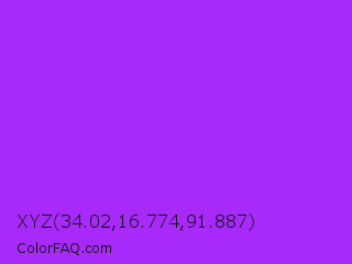 XYZ 34.02,16.774,91.887 Color is a normal purple color and the nearest color is Veronica #a020f0. Hex code #a72afa and RGB value is rgb(167,42,250). In RGB color space, this color is composed of 65% red, 16% green, 98% blue, In CMYK color space, this color is composed of 33% cyan, 83% magenta, 0% yellow , 2% black , In HSL color space, this color has a hue angle of 276° , 95% saturation and 57% lightness.
