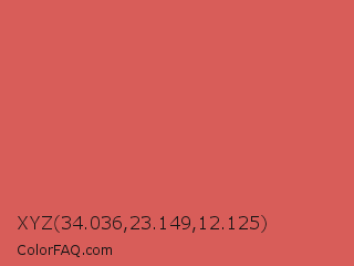 XYZ 34.036,23.149,12.125 Color is a normal red color and the nearest color is Roman #de6360. Hex code #d85d59 and RGB value is rgb(216,93,89). In RGB color space, this color is composed of 85% red, 36% green, 35% blue, In CMYK color space, this color is composed of 0% cyan, 57% magenta, 59% yellow , 15% black , In HSL color space, this color has a hue angle of 2° , 62% saturation and 60% lightness.
