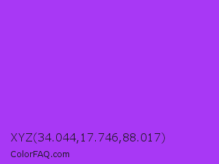 XYZ 34.044,17.746,88.017 Color is a normal purple color and the nearest color is Veronica #a020f0. Hex code #a838f5 and RGB value is rgb(168,56,245). In RGB color space, this color is composed of 66% red, 22% green, 96% blue, In CMYK color space, this color is composed of 31% cyan, 77% magenta, 0% yellow , 4% black , In HSL color space, this color has a hue angle of 276° , 90% saturation and 59% lightness.