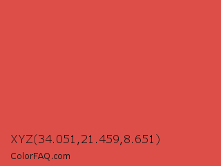 XYZ 34.051,21.459,8.651 Color is a normal red color and the nearest color is Carmine Pink #eb4c42. Hex code #de4e49 and RGB value is rgb(222,78,73). In RGB color space, this color is composed of 87% red, 31% green, 29% blue, In CMYK color space, this color is composed of 0% cyan, 65% magenta, 67% yellow , 13% black , In HSL color space, this color has a hue angle of 2° , 69% saturation and 58% lightness.