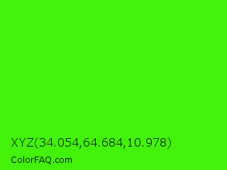 XYZ 34.054,64.684,10.978 Color is a normal green color and the nearest color is Harlequin #3fff00. Hex code #42f20a and RGB value is rgb(66,242,10). In RGB color space, this color is composed of 26% red, 95% green, 4% blue, In CMYK color space, this color is composed of 73% cyan, 0% magenta, 96% yellow , 5% black , In HSL color space, this color has a hue angle of 106° , 92% saturation and 49% lightness.
