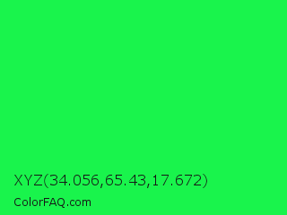 XYZ 34.056,65.43,17.672 Color is a normal green color and the nearest color is Malachite #0bda51. Hex code #19f44c and RGB value is rgb(25,244,76). In RGB color space, this color is composed of 10% red, 96% green, 30% blue, In CMYK color space, this color is composed of 90% cyan, 0% magenta, 69% yellow , 4% black , In HSL color space, this color has a hue angle of 134° , 91% saturation and 53% lightness.
