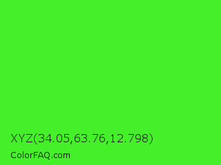 XYZ 34.05,63.76,12.798 Color is a normal green color and the nearest color is Neon Green #39ff14. Hex code #45f02b and RGB value is rgb(69,240,43). In RGB color space, this color is composed of 27% red, 94% green, 17% blue, In CMYK color space, this color is composed of 71% cyan, 0% magenta, 82% yellow , 6% black , In HSL color space, this color has a hue angle of 112° , 87% saturation and 55% lightness.
