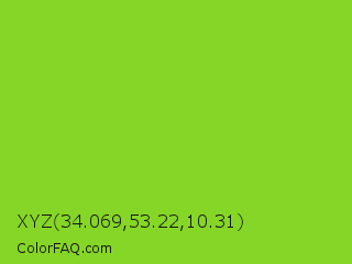 XYZ 34.069,53.22,10.31 Color is a normal green color and the nearest color is Atlantis #97cd2d. Hex code #85d626 and RGB value is rgb(133,214,38). In RGB color space, this color is composed of 52% red, 84% green, 15% blue, In CMYK color space, this color is composed of 38% cyan, 0% magenta, 82% yellow , 16% black , In HSL color space, this color has a hue angle of 88° , 70% saturation and 49% lightness.