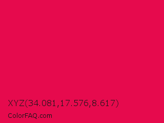 XYZ 34.081,17.576,8.617 Color is a normal rose color and the nearest color is Razzmatazz Crayola #e30b5c. Hex code #e60a4d and RGB value is rgb(230,10,77). In RGB color space, this color is composed of 90% red, 4% green, 30% blue, In CMYK color space, this color is composed of 0% cyan, 96% magenta, 67% yellow , 10% black , In HSL color space, this color has a hue angle of 342° , 92% saturation and 47% lightness.