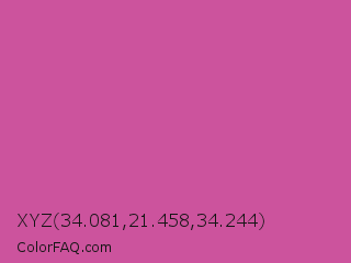 XYZ 34.081,21.458,34.244 Color is a normal magenta color and the nearest color is Pink Pantone #d74894. Hex code #cc539d and RGB value is rgb(204,83,157). In RGB color space, this color is composed of 80% red, 33% green, 62% blue, In CMYK color space, this color is composed of 0% cyan, 59% magenta, 23% yellow , 20% black , In HSL color space, this color has a hue angle of 323° , 54% saturation and 56% lightness.