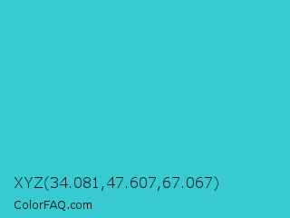 XYZ 34.081,47.607,67.067 Color is a normal cyan color and the nearest color is Scooter #2ebfd4. Hex code #37cad0 and RGB value is rgb(55,202,208). In RGB color space, this color is composed of 22% red, 79% green, 82% blue, In CMYK color space, this color is composed of 74% cyan, 3% magenta, 0% yellow , 18% black , In HSL color space, this color has a hue angle of 182° , 62% saturation and 52% lightness.