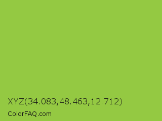 XYZ 34.083,48.463,12.712 Color is a normal green color and the nearest color is Yellow Green #9acd32. Hex code #94c942 and RGB value is rgb(148,201,66). In RGB color space, this color is composed of 58% red, 79% green, 26% blue, In CMYK color space, this color is composed of 26% cyan, 0% magenta, 67% yellow , 21% black , In HSL color space, this color has a hue angle of 84° , 56% saturation and 52% lightness.