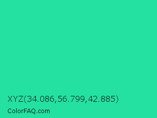 XYZ 34.086,56.799,42.885 Color is a normal green color and the nearest color is Shamrock #33cc99. Hex code #24e1a1 and RGB value is rgb(36,225,161). In RGB color space, this color is composed of 14% red, 88% green, 63% blue, In CMYK color space, this color is composed of 84% cyan, 0% magenta, 28% yellow , 12% black , In HSL color space, this color has a hue angle of 160° , 76% saturation and 51% lightness.