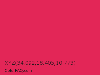 XYZ 34.092,18.405,10.773 Color is a normal rose color and the nearest color is Amaranth #e52b50. Hex code #e32657 and RGB value is rgb(227,38,87). In RGB color space, this color is composed of 89% red, 15% green, 34% blue, In CMYK color space, this color is composed of 0% cyan, 83% magenta, 62% yellow , 11% black , In HSL color space, this color has a hue angle of 344° , 77% saturation and 52% lightness.