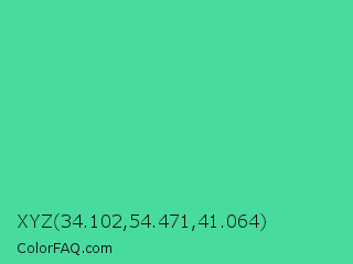 XYZ 34.102,54.471,41.064 Color is a normal green color and the nearest color is Eucalyptus #44d7a8. Hex code #47db9e and RGB value is rgb(71,219,158). In RGB color space, this color is composed of 28% red, 86% green, 62% blue, In CMYK color space, this color is composed of 68% cyan, 0% magenta, 28% yellow , 14% black , In HSL color space, this color has a hue angle of 155° , 67% saturation and 57% lightness.
