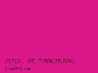 XYZ 34.107,17.508,25.626 Color is a normal magenta color and the nearest color is Vivid Cerise #da1d81. Hex code #db178a and RGB value is rgb(219,23,138). In RGB color space, this color is composed of 86% red, 9% green, 54% blue, In CMYK color space, this color is composed of 0% cyan, 89% magenta, 37% yellow , 14% black , In HSL color space, this color has a hue angle of 325° , 81% saturation and 47% lightness.