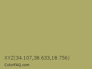XYZ 34.107,38.633,18.756 Color is a normal yellow color and the nearest color is Green Smoke #a4af6e. Hex code #adaa68 and RGB value is rgb(173,170,104). In RGB color space, this color is composed of 68% red, 67% green, 41% blue, In CMYK color space, this color is composed of 0% cyan, 2% magenta, 40% yellow , 32% black , In HSL color space, this color has a hue angle of 57° , 30% saturation and 54% lightness.