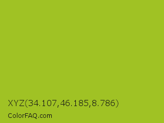 XYZ 34.107,46.185,8.786 Color is a normal lime color and the nearest color is Atlantis #97cd2d. Hex code #a0c224 and RGB value is rgb(160,194,36). In RGB color space, this color is composed of 63% red, 76% green, 14% blue, In CMYK color space, this color is composed of 18% cyan, 0% magenta, 81% yellow , 24% black , In HSL color space, this color has a hue angle of 73° , 69% saturation and 45% lightness.