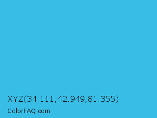 XYZ 34.111,42.949,81.355 Color is a normal blue color and the nearest color is Picton Blue #45b1e8. Hex code #38bde6 and RGB value is rgb(56,189,230). In RGB color space, this color is composed of 22% red, 74% green, 90% blue, In CMYK color space, this color is composed of 76% cyan, 18% magenta, 0% yellow , 10% black , In HSL color space, this color has a hue angle of 194° , 78% saturation and 56% lightness.