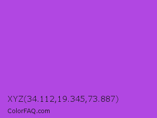 XYZ 34.112,19.345,73.887 Color is a normal purple color and the nearest color is Medium Orchid #ba55d3. Hex code #b147e2 and RGB value is rgb(177,71,226). In RGB color space, this color is composed of 69% red, 28% green, 89% blue, In CMYK color space, this color is composed of 22% cyan, 69% magenta, 0% yellow , 11% black , In HSL color space, this color has a hue angle of 281° , 73% saturation and 58% lightness.
