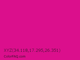XYZ 34.118,17.295,26.351 Color is a normal magenta color and the nearest color is Vivid Cerise #da1d81. Hex code #db0f8c and RGB value is rgb(219,15,140). In RGB color space, this color is composed of 86% red, 6% green, 55% blue, In CMYK color space, this color is composed of 0% cyan, 93% magenta, 36% yellow , 14% black , In HSL color space, this color has a hue angle of 323° , 87% saturation and 46% lightness.