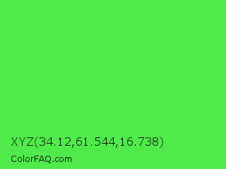 XYZ 34.12,61.544,16.738 Color is a light green color and the nearest color is Screamin Green #66ff66. Hex code #4eeb4b and RGB value is rgb(78,235,75). In RGB color space, this color is composed of 31% red, 92% green, 29% blue, In CMYK color space, this color is composed of 67% cyan, 0% magenta, 68% yellow , 8% black , In HSL color space, this color has a hue angle of 119° , 80% saturation and 61% lightness.