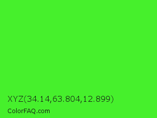 XYZ 34.14,63.804,12.899 Color is a normal green color and the nearest color is Neon Green #39ff14. Hex code #46f02c and RGB value is rgb(70,240,44). In RGB color space, this color is composed of 27% red, 94% green, 17% blue, In CMYK color space, this color is composed of 71% cyan, 0% magenta, 82% yellow , 6% black , In HSL color space, this color has a hue angle of 112° , 87% saturation and 56% lightness.