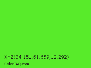 XYZ 34.151,61.659,12.292 Color is a normal green color and the nearest color is Harlequin Green #46cb18. Hex code #58eb2a and RGB value is rgb(88,235,42). In RGB color space, this color is composed of 35% red, 92% green, 16% blue, In CMYK color space, this color is composed of 63% cyan, 0% magenta, 82% yellow , 8% black , In HSL color space, this color has a hue angle of 106° , 83% saturation and 54% lightness.