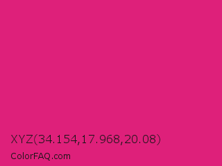 XYZ 34.154,17.968,20.08 Color is a normal rose color and the nearest color is Vivid Cerise #da1d81. Hex code #de207a and RGB value is rgb(222,32,122). In RGB color space, this color is composed of 87% red, 13% green, 48% blue, In CMYK color space, this color is composed of 0% cyan, 86% magenta, 45% yellow , 13% black , In HSL color space, this color has a hue angle of 332° , 75% saturation and 50% lightness.