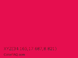 XYZ 34.165,17.687,8.821 Color is a normal rose color and the nearest color is Spanish Crimson #e51a4c. Hex code #e60e4e and RGB value is rgb(230,14,78). In RGB color space, this color is composed of 90% red, 5% green, 31% blue, In CMYK color space, this color is composed of 0% cyan, 94% magenta, 66% yellow , 10% black , In HSL color space, this color has a hue angle of 342° , 89% saturation and 48% lightness.