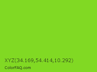XYZ 34.169,54.414,10.292 Color is a normal green color and the nearest color is Atlantis #97cd2d. Hex code #81d923 and RGB value is rgb(129,217,35). In RGB color space, this color is composed of 51% red, 85% green, 14% blue, In CMYK color space, this color is composed of 41% cyan, 0% magenta, 84% yellow , 15% black , In HSL color space, this color has a hue angle of 89° , 72% saturation and 49% lightness.