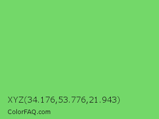 XYZ 34.176,53.776,21.943 Color is a light green color and the nearest color is Pastel Green #77dd77. Hex code #73d869 and RGB value is rgb(115,216,105). In RGB color space, this color is composed of 45% red, 85% green, 41% blue, In CMYK color space, this color is composed of 47% cyan, 0% magenta, 51% yellow , 15% black , In HSL color space, this color has a hue angle of 115° , 59% saturation and 63% lightness.
